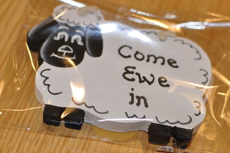 Colourful handmade gifts include painted Shetland stone and sea-glass ornaments, pictures and decorated mirrors, all made on the island.